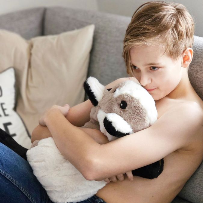 Et vektbamse-"cover" med en ultramyk pels, en avtagbar vektpose fylt med organiske kirsebærsteiner, mulighet for enten varme- eller kuldeterapi , en avtagbar duftpose med beroligende lavendel og en innebygd pute til å hvile hodet på eller kose med uten å få fingrene varme.