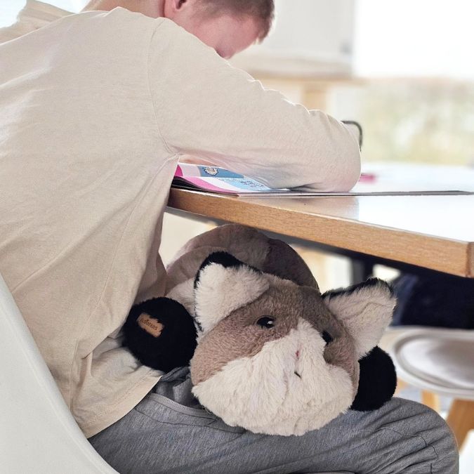 Inne i en FLOOFERS® er det en avtagbar vektpose med organiske kirsebærsteiner som kan varmes eller avkjøles. Du får tilgang til vektposen via en klassisk putelukking på magen – ingen glidelåser eller plast.